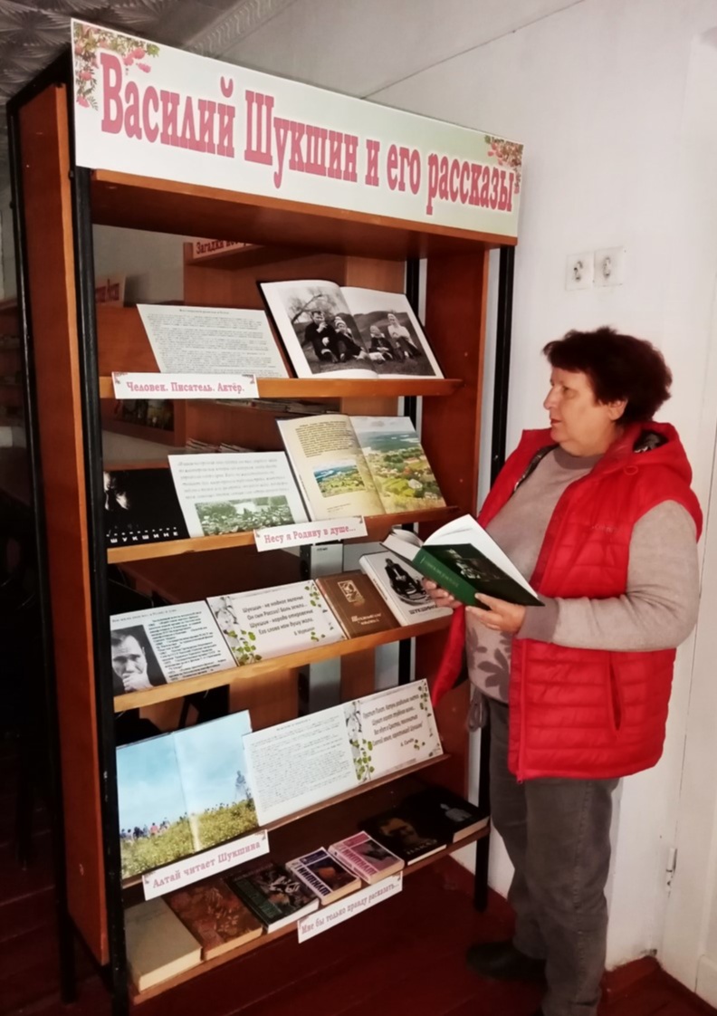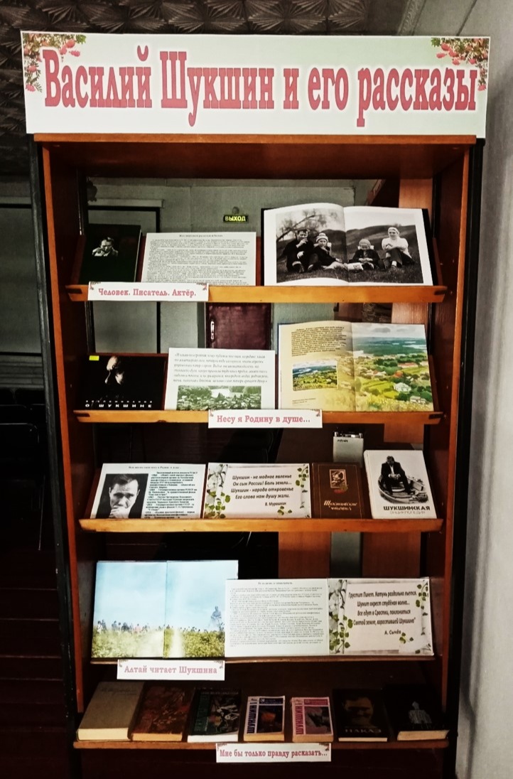 Талант Василия Шукшина поистине неповторим и многогранен. Кинорежиссер, выдающийся киноактер, снявшийся во многих фильмах, прозаик, публицист, киносценарист. В его фильмах можно видеть тонкое влияние литературы, а в его прозе ощущаются зримые черты киноискусства. В день его рождения, 25 июля, в нашей библиотеке была организована юбилейная литературно-музыкальная гостиная «У России много сыновей, но всего один Шукшин Василий», посвященная 95-летию со дня рождения нашего земляка В. М. Шукшина. Мероприятие началось с воспоминаний о жизни и творчестве писателя. Присутствующие узнали о самых значительных событиях в его жизни, о том, каким он был, о его родных и близких, о годах учёбы и службы в армии, о начале литературной и кинематографической деятельности. Некоторые факты из биографии Василия Макаровича стали для участников мероприятия настоящим открытием. Особое внимание в беседе уделила матери Василия Макаровича — Марии Сергеевне, которая оказала значительное и благотворное влияние на сына. В ходе мероприятия звучали: песня «Памяти Шукшина», слова и музыку которой написал наш земляк А. В. Власов, демонстрировались видеоклипы на песни Владимира Высоцкого «Памяти Василия Шукшина» и Сергея Майского «По Чуйскому», отрывки из фильмов «Живет такой парень», «Праздники детства», в котором в качестве главного героя снялся наш земляк Сергей Амосов, стихи о нашем именитом земляке.