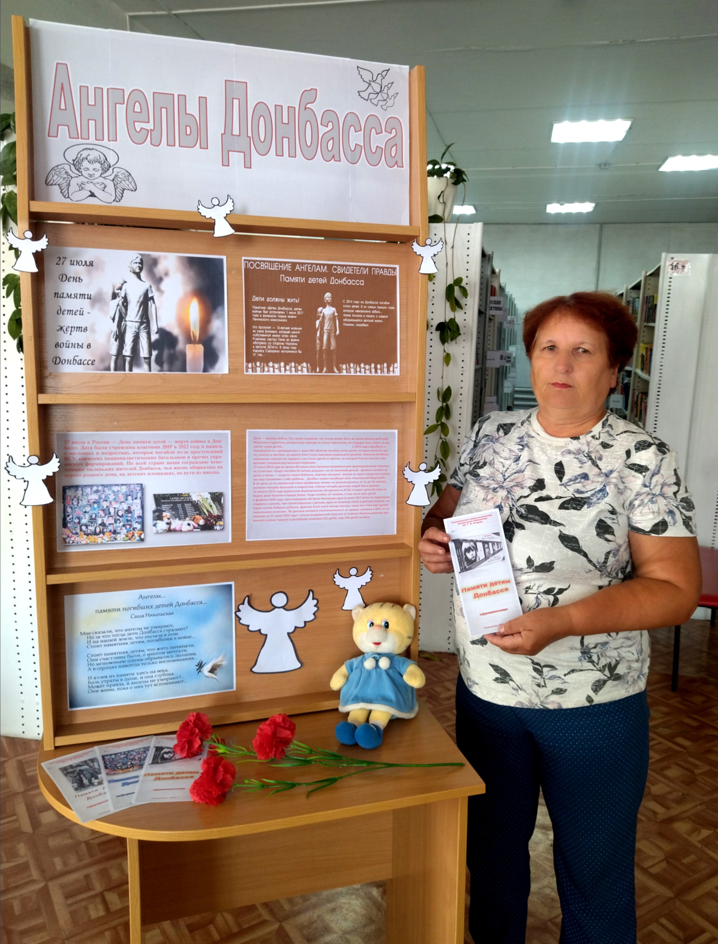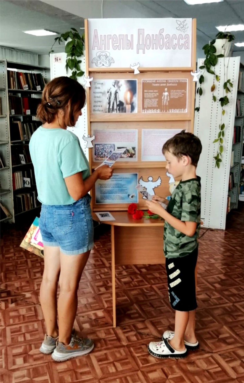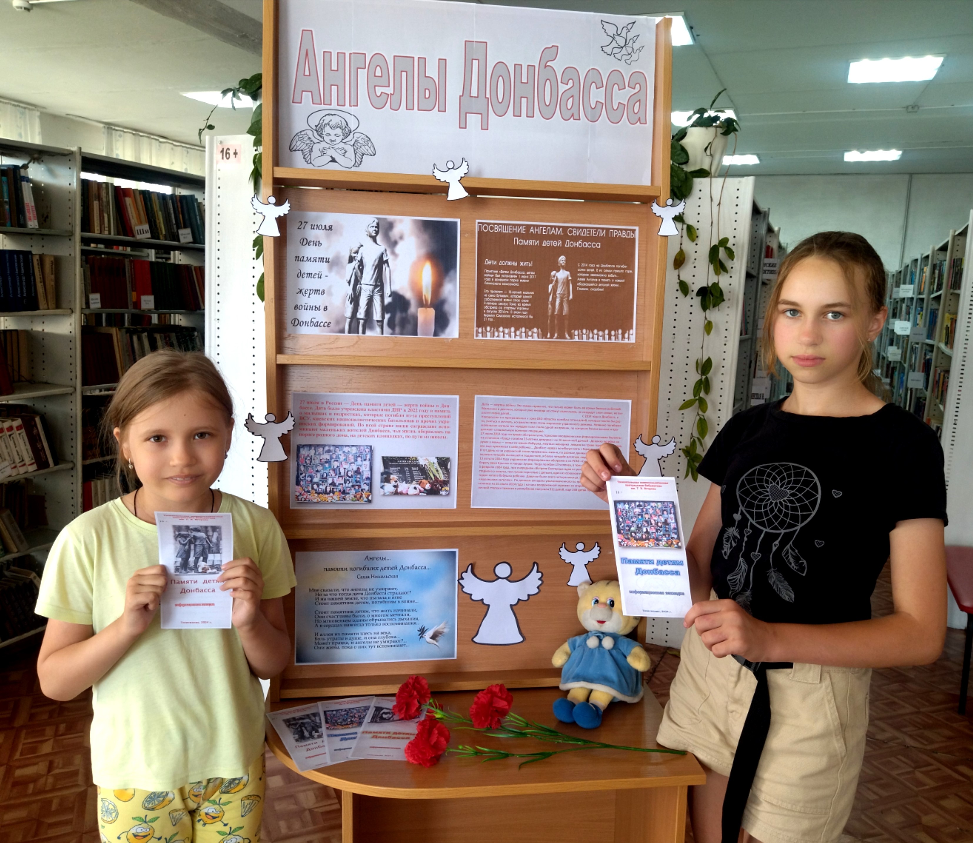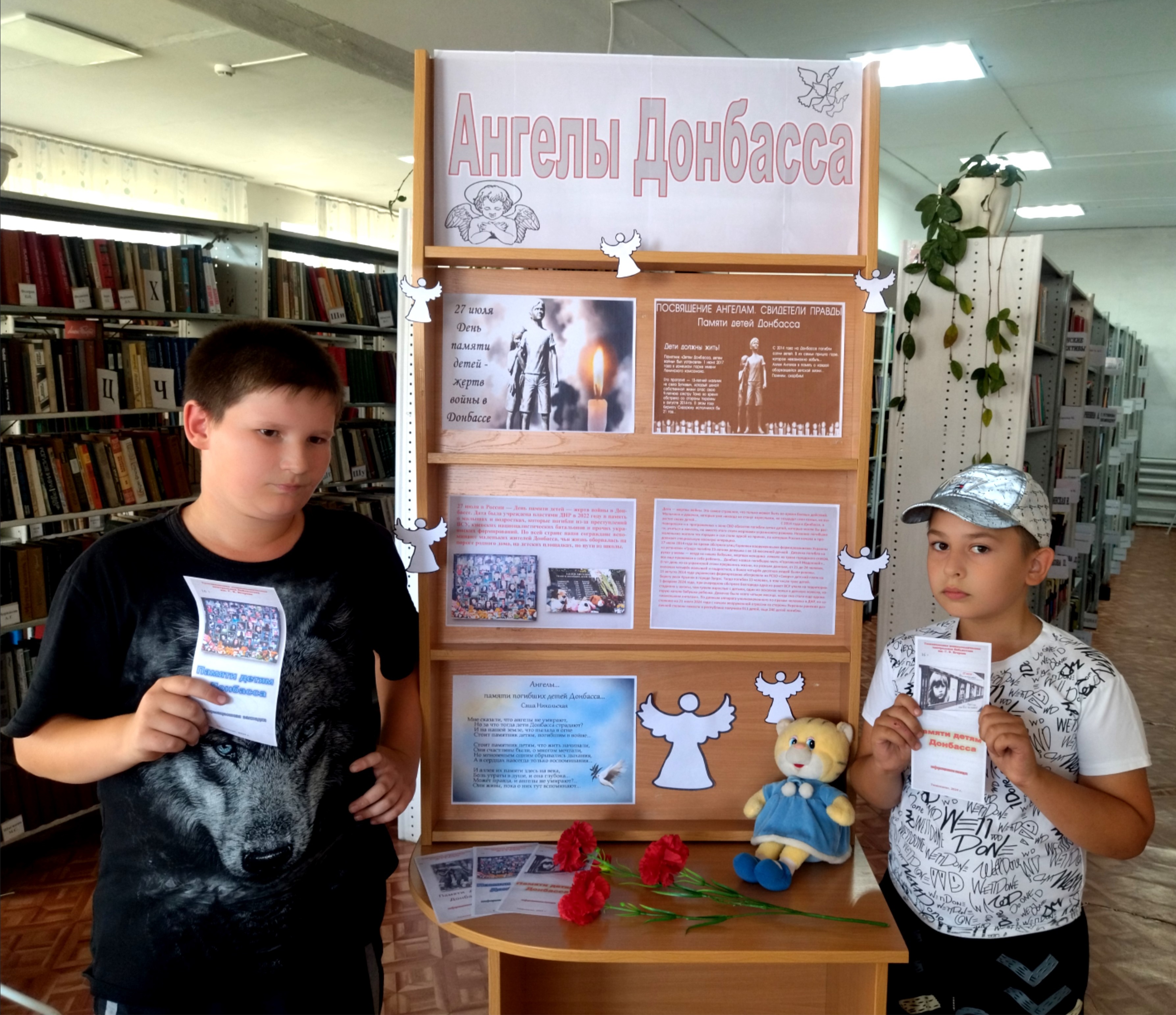 Специалисты библиотеки познакомили молодежь поселка и читателей библиотеки с этим памятным днем, раздали информационные флаеры, представили слайд-презентацию «Памяти погибшим детям Донбасса», рассказав о том, что за время боевых действий на территории Донецкой Народной Республики погибли более двух сотен детей и что в память о них открыт мемориальный памятник — Аллея Ангелов в городе Донецке в 2015 году. На каменной стеле в алфавитном порядке высечены имена погибших в этой войне детей Донбасса, а также указан их возраст. Самым маленьким жертвам было всего лишь по годику.