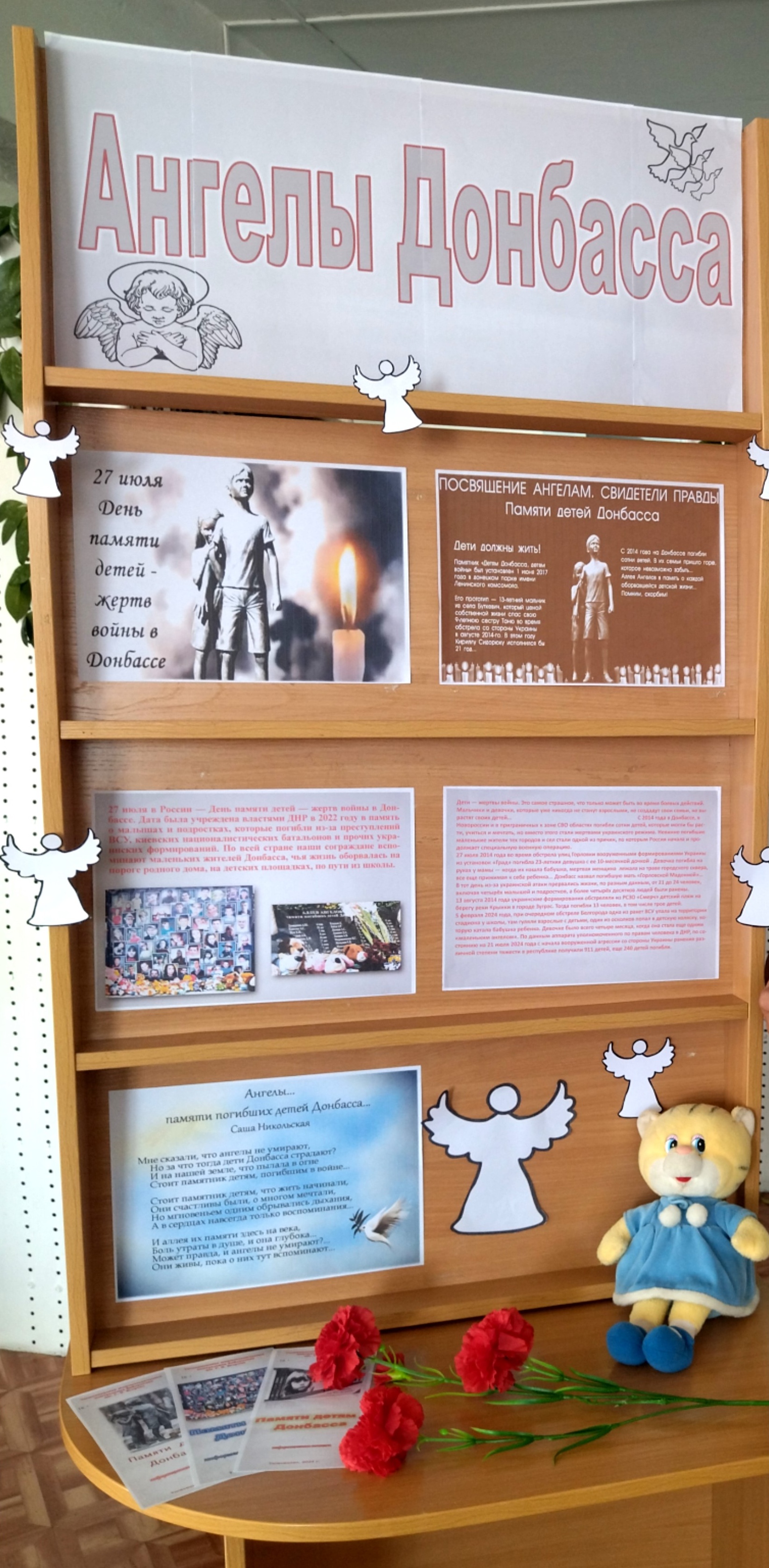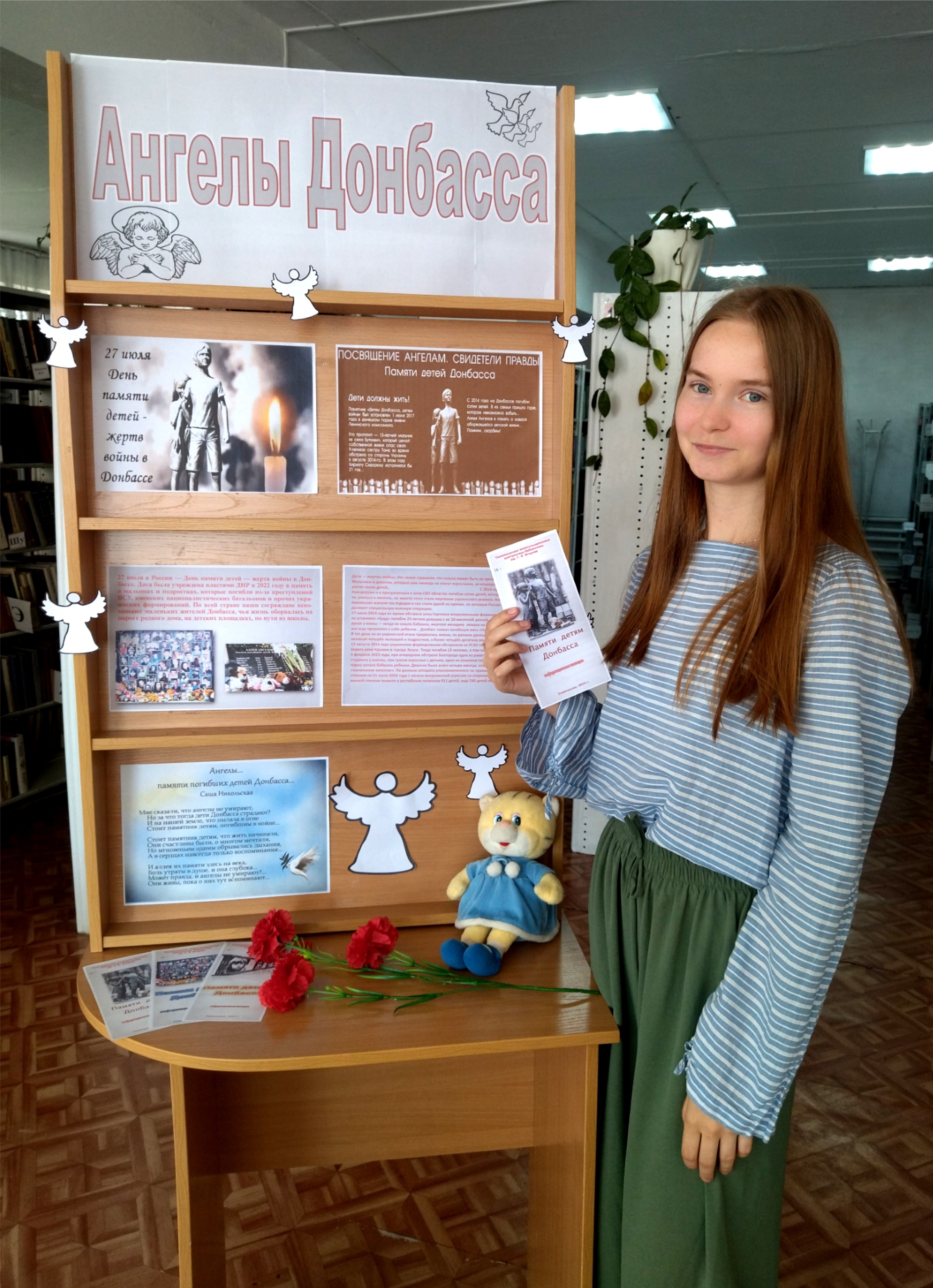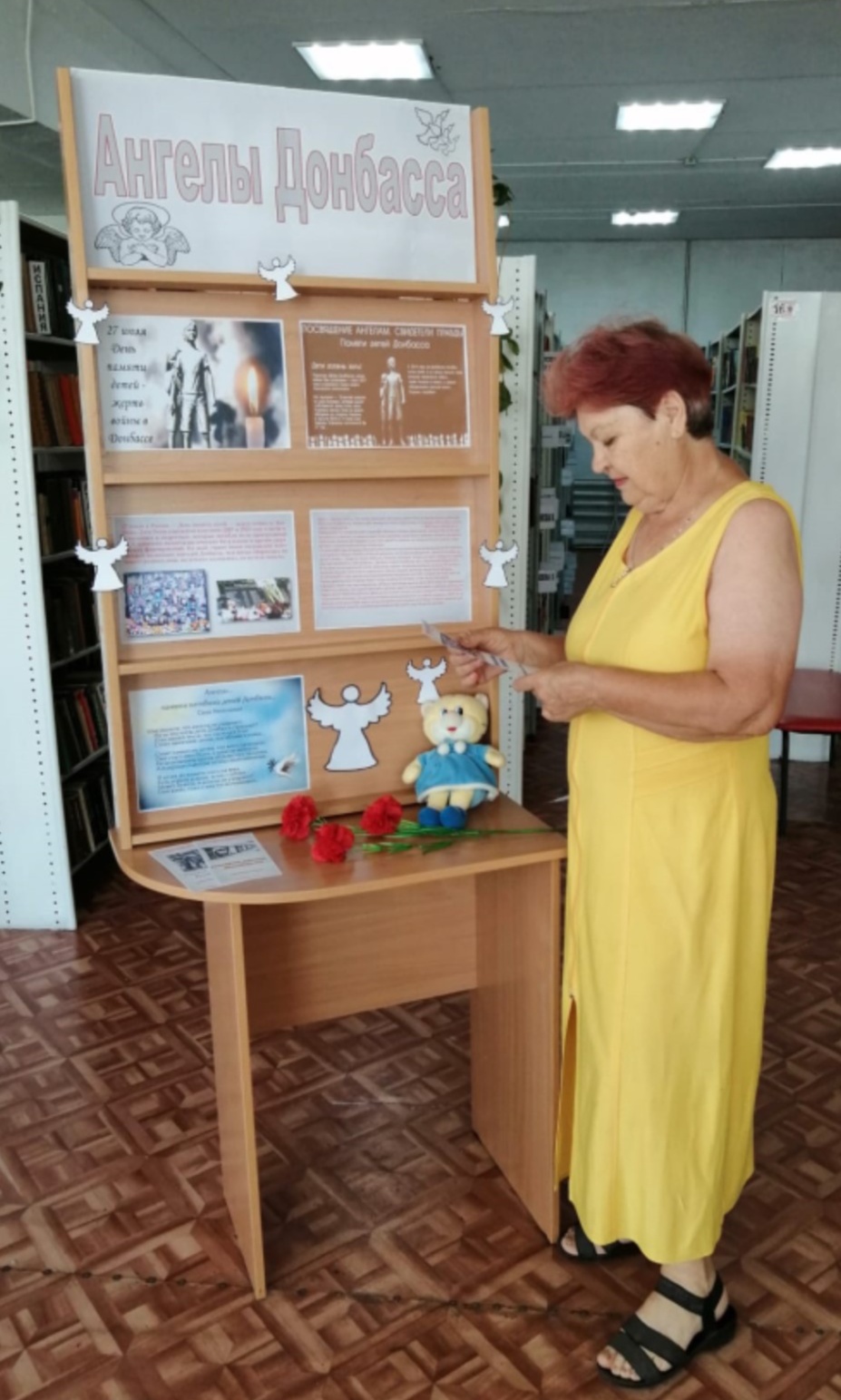 Специалисты библиотеки познакомили молодежь поселка и читателей библиотеки с этим памятным днем, раздали информационные флаеры, представили слайд-презентацию «Памяти погибшим детям Донбасса», рассказав о том, что за время боевых действий на территории Донецкой Народной Республики погибли более двух сотен детей и что в память о них открыт мемориальный памятник — Аллея Ангелов в городе Донецке в 2015 году. На каменной стеле в алфавитном порядке высечены имена погибших в этой войне детей Донбасса, а также указан их возраст. Самым маленьким жертвам было всего лишь по годику.