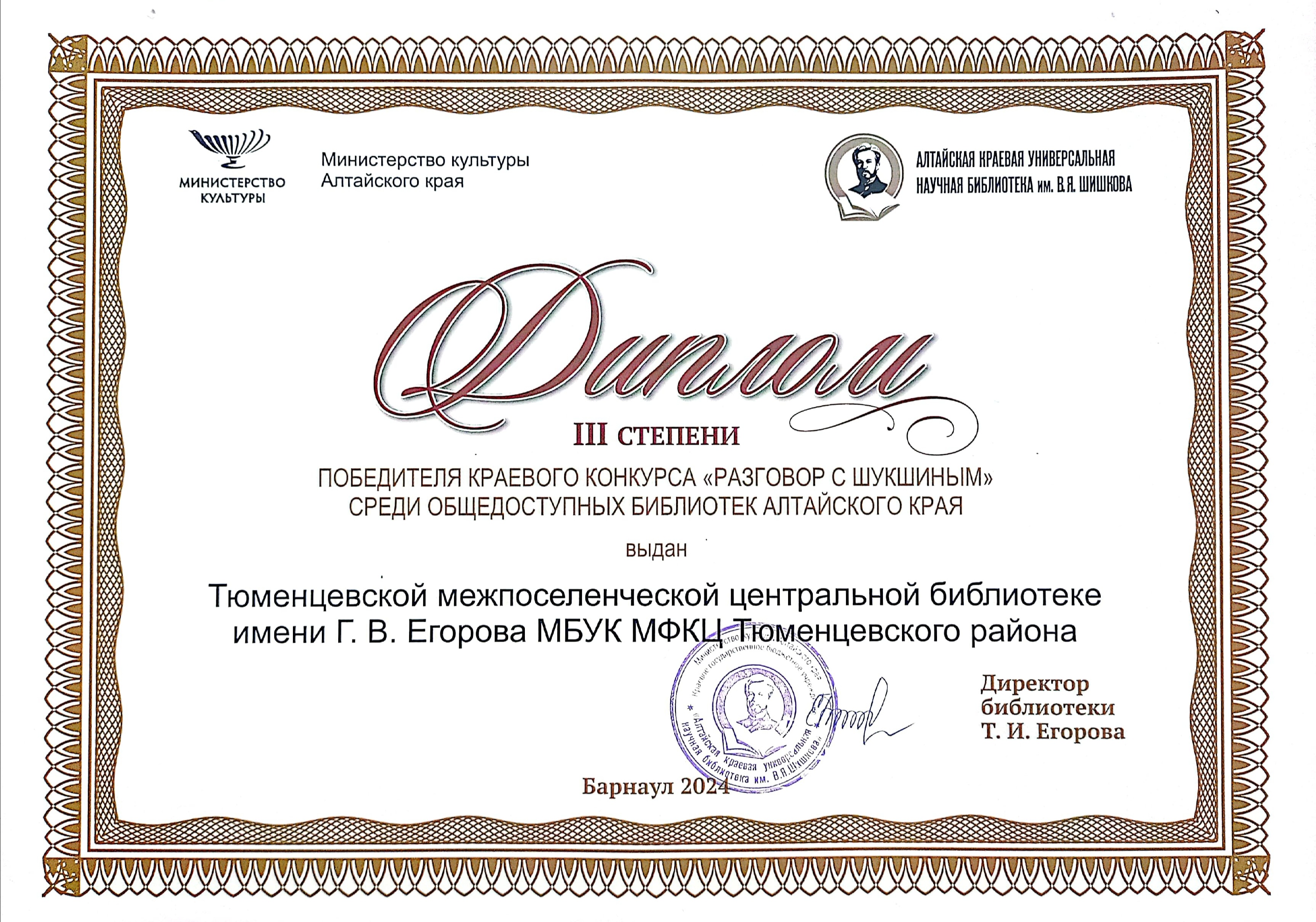 17 октября в рамках единого методического дня «Планирование-2025» в Алтайской краевой универсальной научной библиотеки им. В. Я. Шишкова состоялась торжественная церемония награждения победителей краевого конкурса «Разговор с Шукшиным» среди общедоступных библиотек Алтайского края. Отдел «Тюменцевская межпоселенческая центральная библиотека им. Г. В. Егорова» занял в конкурсе третье место и был награжден дипломом третьей степени и ценным подарком.