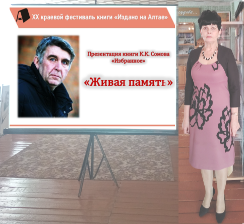 Ведущая мероприятия, заведующая отделом «ТМЦБ им. Г. В. Егорова» Валентина Егорова, познакомила гостей с творчеством замечательного алтайского писателя, рассказала о том, что всю жизнь Константин Сомов увлеченно исследует историю разных войн в нашей российской истории, активно собирает редкие материалы, касающиеся истории Алтайского края и всей России в XX веке.