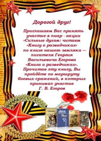 Более тысячи писателей принимали участие в боевых действиях на фронтах Великой Отечественной войны, «пером и автоматом» защищая родную землю. Из них более 400 не вернулись с войны, 21 стали Героями Советского Союза. Нашему земляку, писателю, фронтовику Георгию Васильевичу Егорову посчастливилось вернуться, хотя к смерти он был ближе других. Об этом свидетельствуют шесть ранений. Во время войны он командовал взводом конной разведки. Фронтовые дневники разведчика Егорова были положены в основу «Книги о разведчиках», в которой он рассказал нам о фронтовых подвигах и буднях своих боевых побратимов. Этой книге была посвящена пиар-акция «Сильные духом: читаем «Книгу о разведчиках», в ходе которой жители нашего района познакомились с основными моментами жизни и творчества писателя, с героями «Книги о разведчиках» и вместе с автором прошли по его фронтовым дорогам. В акции приняли участие 40 человек. Многие из них поделились своими отзывами о книге.
