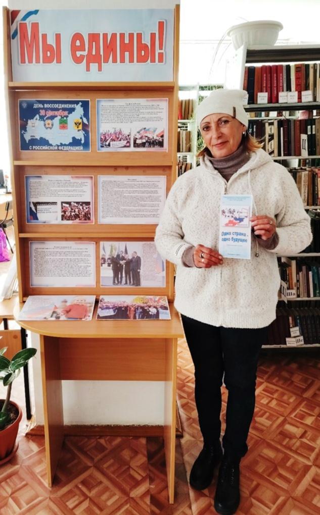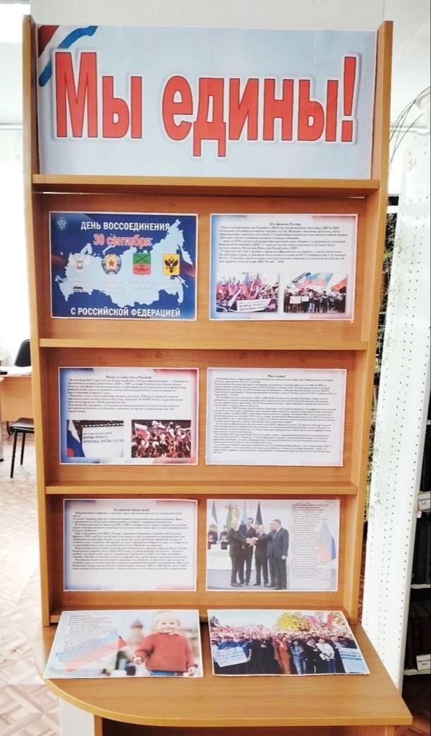 Этот день официально признан праздником и получил название «День воссоединения Донецкой и Луганской народных республик, Запорожской и Херсонской областей с Российской Федерацией». Он отражает изменения, произошедшие в геополитической карте страны, а также является точкой отсчёта нового этапа в жизни миллионов людей. Об этом историческом событии читателям напомнила выставка-репортаж «Мы едины!», на которой были представлены книги, информационные листы, фотоматериалы, связанные с событиями присоединения новых территорий, а также отражающие жизнь в Донбассе и Новороссии сегодня. В представленных на выставке материалах рассказывается об экономическом развитии и потенциале, памятниках и памятных местах, о значении Новороссии для России.