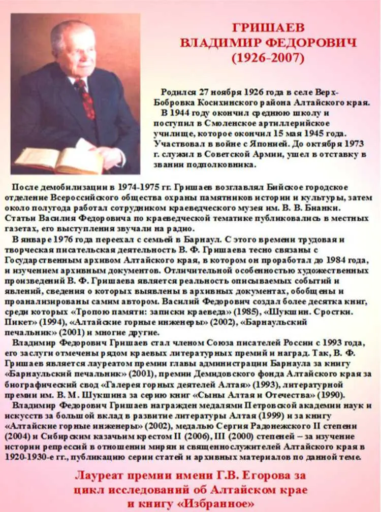 У нас на Алтае эта книга уже издана 4 раза и один раз – в Москве. Объем ее за это время увеличился втрое: отыскались новые люди, факты, материалы.
