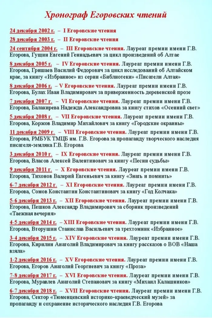 В этом неоценимую помощь жителям нашего района могут оказать книги Г. В. Егорова «Крушение Рогова», «Солона ты, земля», «На земле живущим», «Книга о разведчиках», повести «Горсть огня», «Сибиряки». В них запечатлены события 20 века, описаны наши села, старинные улицы села Тюменцева, где происходили исторические события, в своих книгах Г. В. Егоров пишет о наших отцах и дедах, в них описаны судьбы сотен наших земляков, достоверные и интересные истории из жизни нашего села, района. И в них, как в капле росы, отражается история Родины. Ведущие темы в творчестве Г. В. Егорова события гражданской войны в Сибири и становление советской власти, Великая Отечественная война, жизнь простого народа в годы сталинских репрессий.