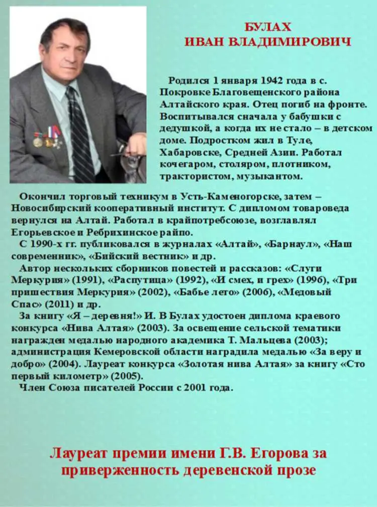 Я ни одного обвинения в свой адрес не признал. И тогда было сфабриковано персональное дело. Писательская партийная организация объявила мне выговор, но бюро Центрального райкома партии исключило из рядов КПСС за потерю бдительности, антисоветские высказывания и очернительство. В обвинении фигурировал и мой злополучный роман. Спасло меня то, что на Алтае в этом году проходила декада советской литературы. Было много известных писателей и, наверное, за меня замолвили словечко, потому горком партии не утвердил решение райкома. Вся эта травля сказалась и на здоровье, и на творчестве. Буквально на несколько лет я был выбит из колеи. Трудно было и материально, и морально…»
