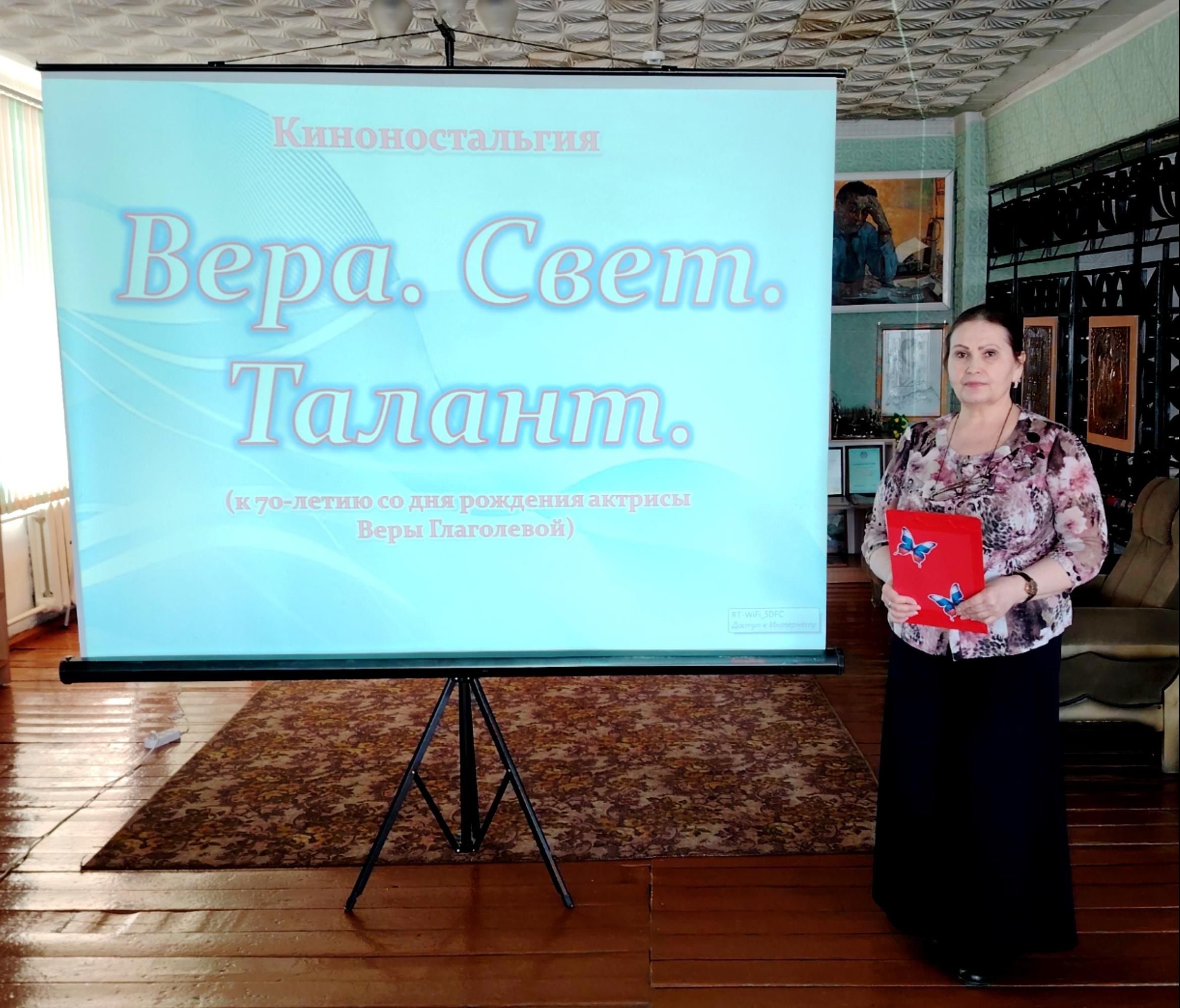 Для участников литературного видеосалона «Орфей» состоялось мероприятие — киноностальгия «Вера. Свет. Талант», посвященная 70-летию со дня рождения народной артистки России, режиссёра и актрисы Веры Глаголевой. Ведущая рассказала собравшимся о том, как Вера Витальевна пришла к своей профессии актрисы, поделилась важными моментами ее карьерного и жизненного пути. В ходе мероприятия участники посмотрели несколько видеофрагментов, раскрывающих разные грани личности и творчества Веры Глаголевой: «Искренняя, откровенная, уникальная — Вера Глаголева», «Факты биографии», «Хрупкая снаружи, стальная внутри» и другие. Кроме того, были показаны отрывки из известных кинофильмов с её участием и постановкой — «На край света», «Выйти замуж за капитана», «Сломанный свет» и других. Встреча получилась теплой и душевной, позволив участникам клуба вновь окунуться в атмосферу творчества и таланта великой актрисы и режиссера.