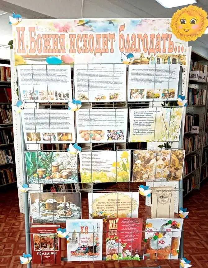 Книги, представленные на выставке, знакомили с историей праздника, о том, как празднуют Пасху в других странах, как подготовиться к празднику, какие блюда приготовить, как украсить пасхальные яйца. Также на выставке были представлены основные атрибуты Пасхи: куличи, крашеные яйца.