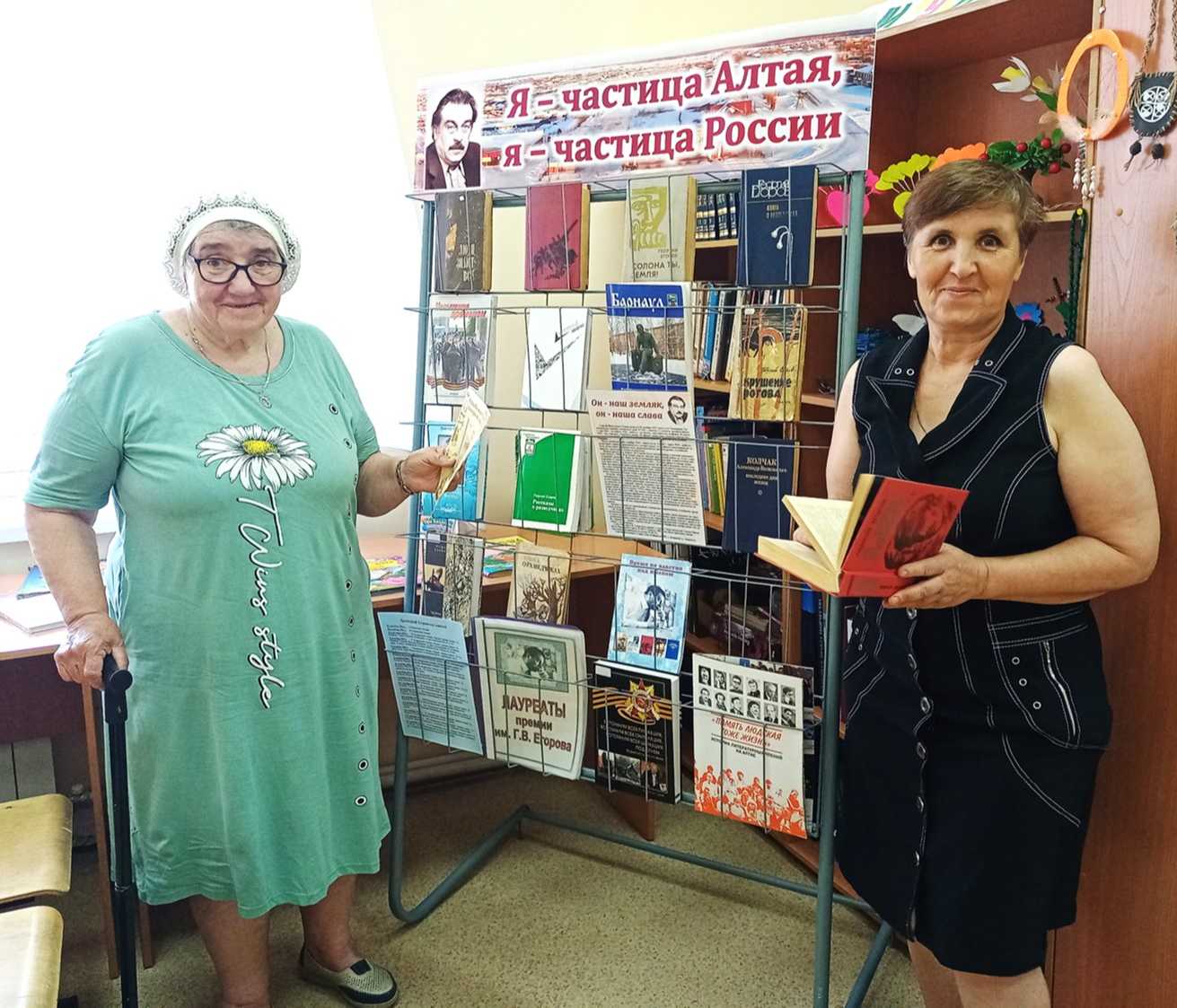 На выставке – инсталляции «Я – частица Алтая, я – частица России», были представлены книги Г. В. Егорова, которые вызывали неподдельный интерес к его творчеству, ведь в них он рассказал нам о самом сокровенном. Документы и фотографии из семейного альбома, воспоминания, информационная продукция, представленные на выставке создавали яркий образ писателя – фронтовика. Прошло уже 100 лет, как нет с нами замечательного талантливого писателя, но его книги вызывают интерес, их читают, помнят, любят.
