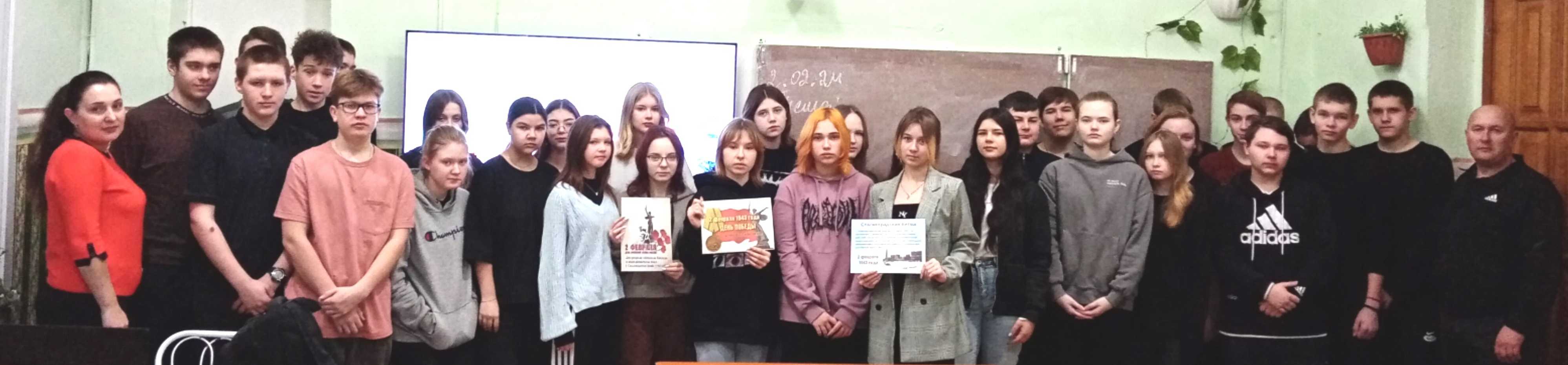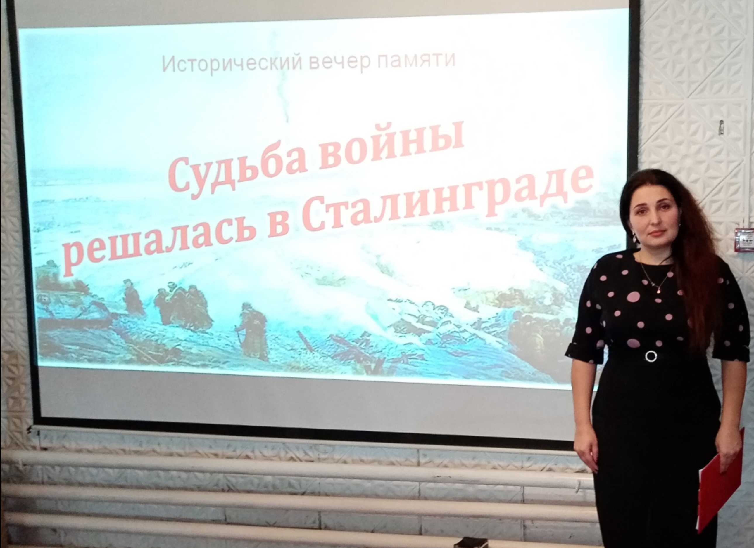 Учащиеся узнали о том, что кровопролитная битва продолжалась 200 дней и ночей. Примером мужества для ребят стал рассказ о доме Павлова, которому дали фамилию сержанта Павлова, оборонявшего дом 59 дней, о главной высоте — Мамаевом кургане, об отважных бойцах, которые бились за каждую улицу и дом, о том, что в Сталинградской битве проявляли мужество не только взрослые, но и дети. Как и взрослые, они переживали голод, холод и гибель родных, но не были сломлены и старались делать все возможное ради Победы. Знакомясь с кадрами презентации «Символ мужества — Сталинград» и военной хроникой, о событиях тех героических лет, учащиеся узнали о великом народном подвиге, душевном порыве, единстве и мужестве защитников города Сталинграда