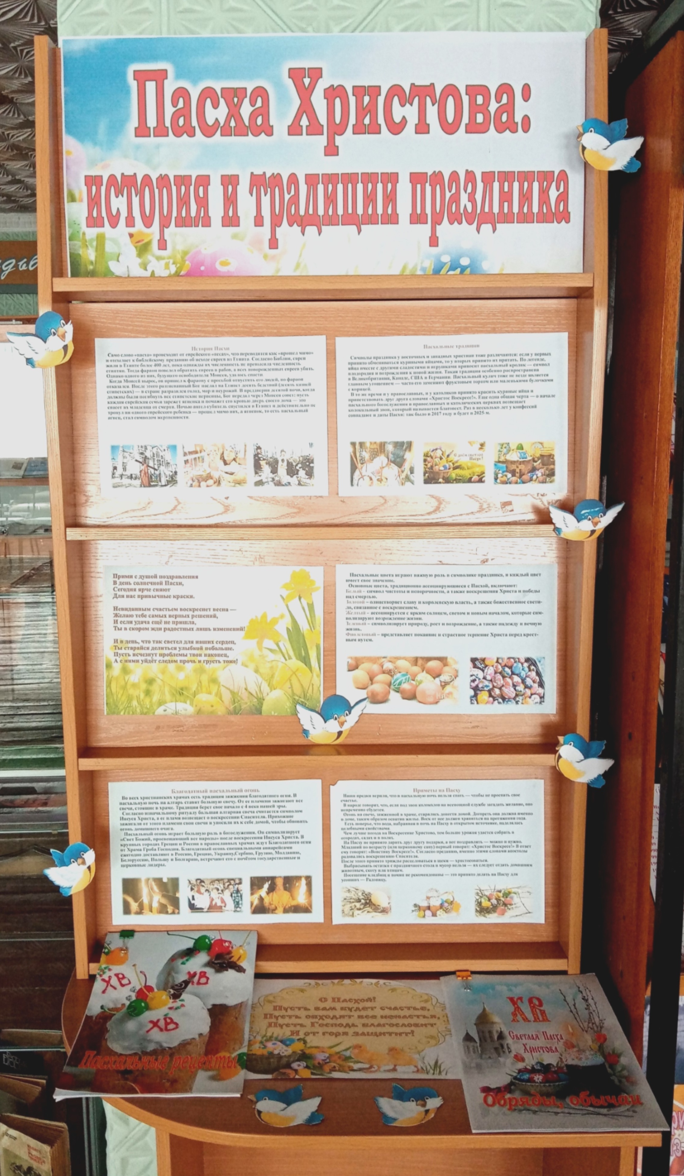 - Выставка-праздник «Пасха Христова: история и традиции праздника» представляла экспозицию, в которую вошли издания, раскрывающие духовную и историческую суть величайшего христианского праздника. Познакомившись с представленной литературой, читатели библиотеки узнали много интересного о православных обрядах и народных традициях, сопутствующих Пасхальной неделе, воспользовались рецептами приготовления пасхальных блюд, особое внимание было уделено секретам символов писанок и крашенок, узнали старинные и новые рецепты пасхальных блюд, способы окрашивания важного религиозного символа — пасхального яйца, а также рецепты пасхальных куличей и кексов.